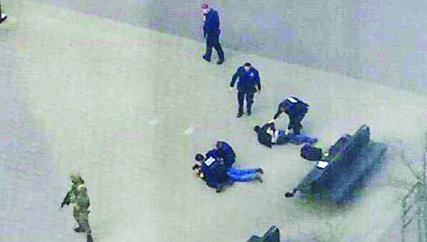 New York Police Department officers detain a protester during a march through the Manhattan borough of New York City calling for social, economic, and racial justice April 29, 2015. Billed as “NYC Rise Up & Shut it Down With Baltimore”, the demonstration was being held to support Baltimore’s protests against police brutality following the April 19 death of Freddie Gray in police custody. REUTERS/Mike Segar