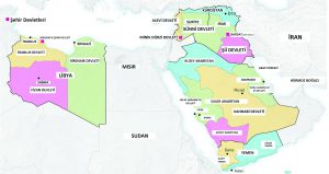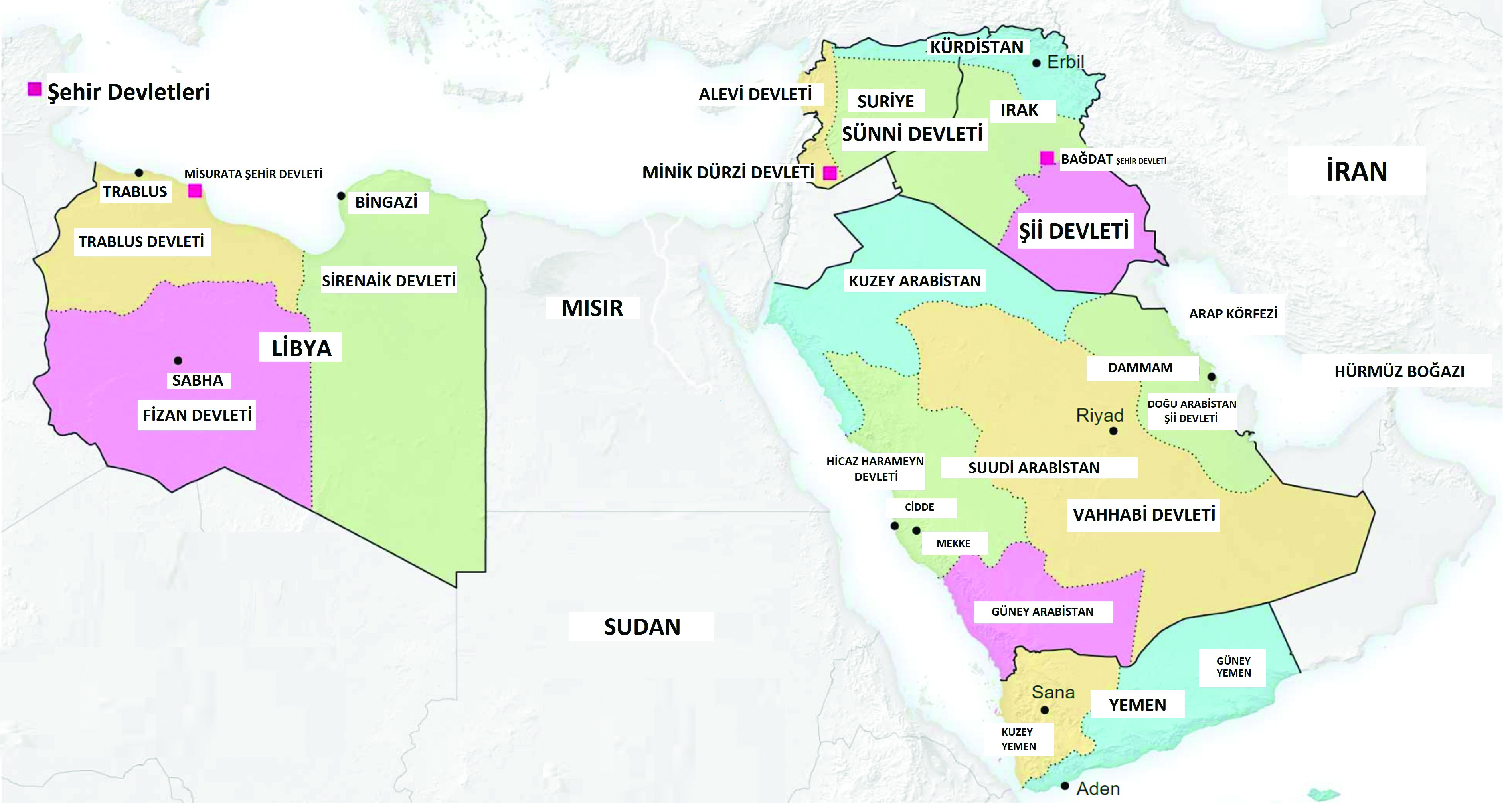 Suudi Arabistan topraklarından ise tam beş devlet çıkmıştı. İlki mübarek topraklar Mekke ve Medine’yi içine alan Batı Arabistan, nam-ı diğer Hicaz Harameyn devletiydi. Tebuk civarında Ürdün’e bitişik Kuzey Arabistan yer alıyordu. Arap körfezinde başkenti Dammam olan Doğu Arabistan Şii devleti vardı. Yemen sınırında Güney Arabistan, geri kalan topraklarda ise Riyad merkezli Vahhabi devleti bulunuyordu.