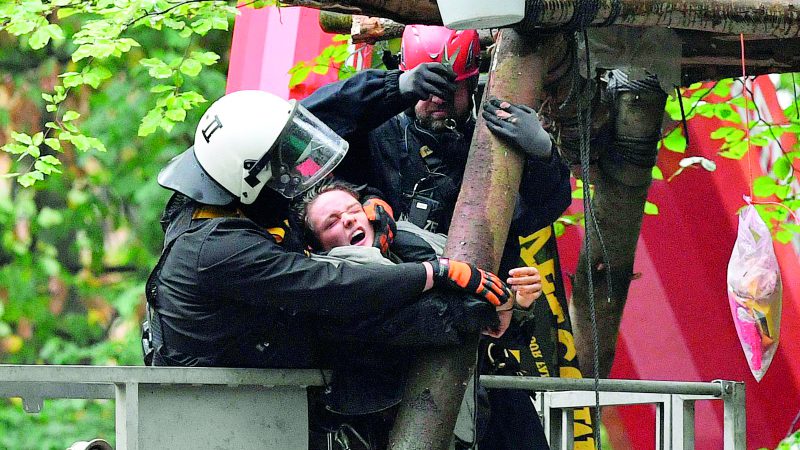 İşin ironik yanı barınakların tahliyesine enerji şirketinin mülkiyet hakları ya da ormanın altındaki linyit yatakları değil, ağaç evlerin yangına karşı korunmamış olmasının gerekçe gösterilmesi. İmar Bakanlığı uzmanları ağaç evlerin (daha doğrusu barakaların) yangın mevzuatına uygun şekilde yapılmadıklarını söyledi. Mevzuata göre, ağaç tepelerindeki evlerde yangın tahliye merdivenlerinin ve korkulukların olması ve aynı zamanda itfaiye araçlarıyla cankurtaranların ağaçlara kolay ulaşabileceği yolların bulunması gerekiyor. Bakanlık, sakinlerinin can güvenliği sağlanamadığı gerekçesiyle ağaç evlerin derhal kaldırılması gerektiği sonucuna vardı! Bunun sonucu şiddet uygulanarak tutuklanan göstericiler oldu. Bazı kadın göstericilere polisin tokat attığı, bazılarının tekmelendiği kameralara yansıdı.