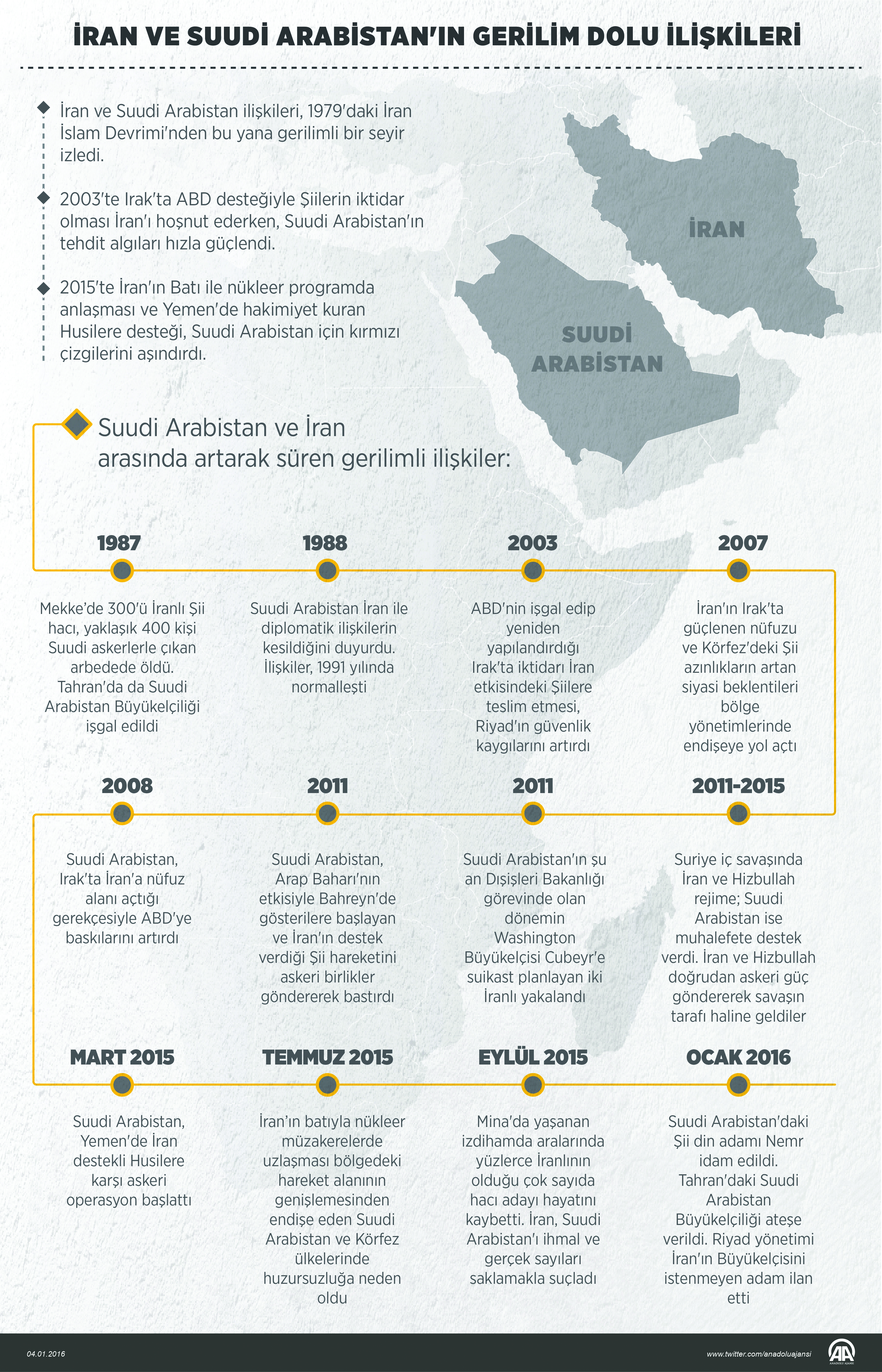 Suud-İran arasındaki gerilimin tarihi, 1979 İran Devrimi’nin olduğu yıllara kadar uzanıyor. İran-Irak Savaşı bu gerilimi besleyen en büyük olaylardan biri idi. İran, o dönemde, Suud’u Saddam Hüseyin’e destek vermek ile suçlamıştı. İki ülke arasındaki kriz, son yıllarda, Suud’un 2011’de Bahreyn’deki gösterilere askeri müdahalesi, Suriye’deki savaş, Lübnan’daki siyasi kriz ve Eylül 2015 Haccı’nda Mina’daki izdihamda yüzlerce İranlı hacının ölümü dolayısıyla daha da tırmanmıştı. Hakikatte, uzmanlar iki ülke arasındaki halihazırdaki krizi son 30 yılın en kötü aşaması olarak okuyorlar. Daha önce iki ülke arasındaki kriz bu dereceye varmamıştı deniliyor.