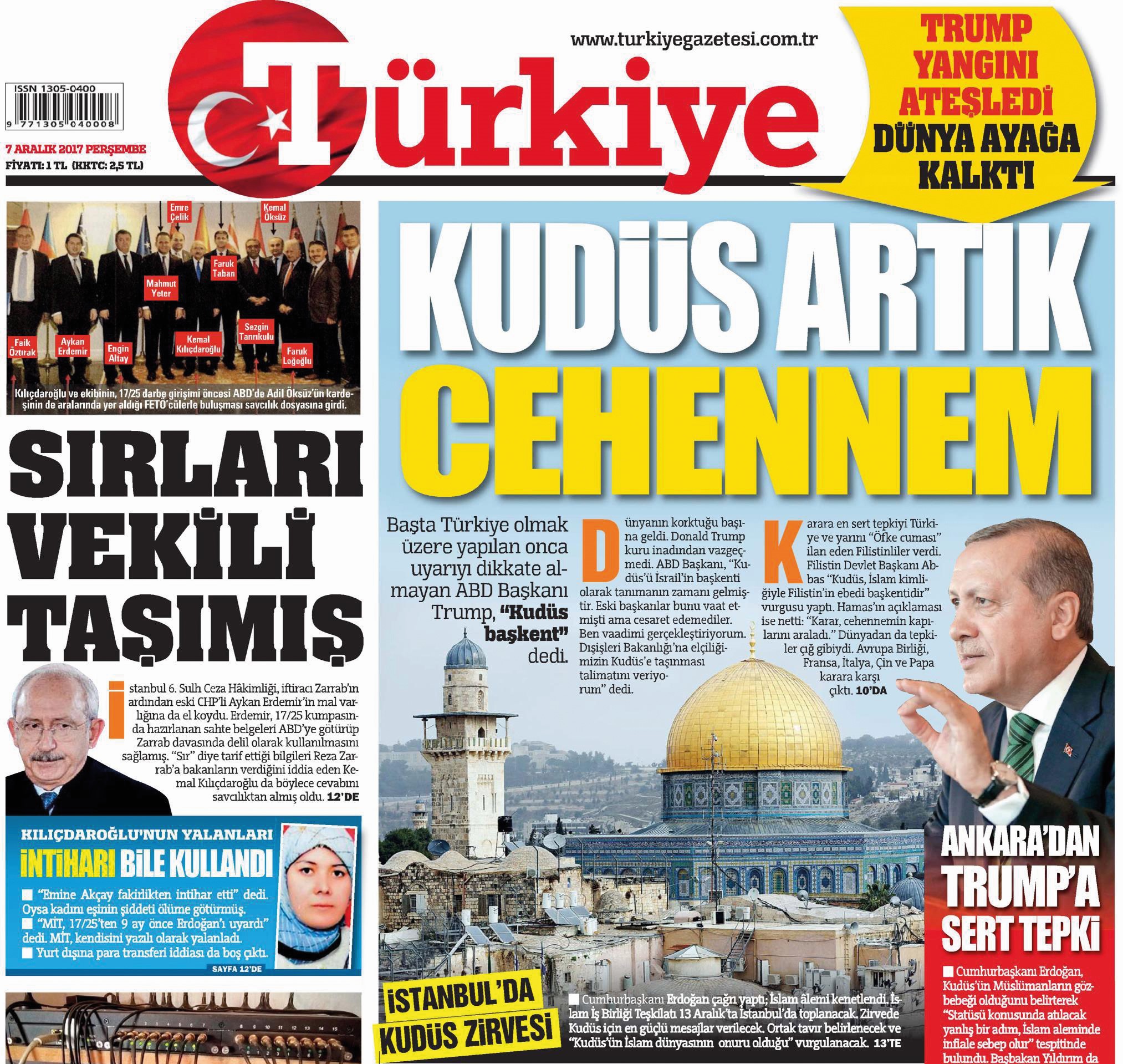 ABD Başkanı Trump Kudüs’ü İsrail’in başkenti ilan etti ve başta Türkiye olmak üzere İslam dünyası ayağa kalktı. Yapılması gereken de buydu. Türk medyası da Kudüs konusunda duyarlı yayınlar yaparak hassasiyetini ortaya koydu. Fakat Türkiye Gazetesinin Trump’un çıkışından sonra attığı manşet biraz sorunluydu. “Kudüs artık Cehennem” cümlesi aşırı hassas olmanın ötesine geçmişti. Ne olursa olsun, kim hangi kararı alırsa alsın, “İslam’ın başkenti hüviyetindeki” kutsal bir belde için “cehennem” ifadesini kullanmak çok yakışıksızdı.