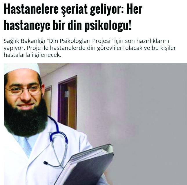 Şeriat geliyor kaçın haberleri 28 Şubat dönemine has değil. Bazıları oldukça yeni. Bir süre önce Sağlık Bakanlığı’nın başlattığı “her hastaneye bir din psikoloğu” projesi de bu bağlamda yorumlananlardan. Şimdi haberi bazı gazetelerin ağzından okuyalım: “AKP’nin hayatın her alanını dinselleştirme ve her alanda imamları görevlendirme uygulamaları hızlanarak devam ediyor. Sağlık Bakanlığı, ‘Din Psikologları Projesi’ ile her hastaneye yine imamlarını atayacak. Devlet yönetiminde, üniversitelerde, okullarda, mahallelerde, yani hayatın hemen her alanında istihdam edilen imamlar, artık hastanelerde bile görev yapacak. Laiklik falan filan… Hastalara kader deyip geçecekler falan filan.”