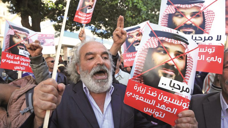 “Cumhurbaşkanlığı makamının Şehid Belaid ve Brahimi’nin kan tacirleri tarafından yargıya müdahale için kullanılması kabul edilemez” açıklamasıyla Sibsi’nin buram buram provokasyon kokan hareketine gereken karşılığı veren Nahda, yaklaşan 2019 seçimleri öncesi siyasi tansiyonun Tunus’a zarar vereceğini ifade ederek gerilimi düşürmek için elinden geleni yaptı. Ancak Sibsi’nin niyeti pek halis görünmüyordu. 29 Kasım’daki MGK toplantısında Nahda’nın yaptığı açıklamayı eleştiren Sibsi’nin olaya ilişkin savunması oldukça basitti: “Cumhurbaşkanı istediği kişiyle görüşebilir ve konuklarının sözlerini kısıtlamaz.” Ayrıca yavuz hırsız olarak ev sahibini bastırması gerekiyordu. Nitekim konuyu yargıya taşıyacağını söylemeyi ihmal etmedi. Peki, bu akılları Sibsi’ye kim verdi? Bu da bizi atılan ikinci yanlış adıma götürüyor. Sibsi, 26 Kasım günü Nahda’ya iftira atan hukukçuları misafir ettikten sadece bir gün sonra, 27 Kasım’da bir başka konuğu makamında ağırladı. Bilin bakalım, bu konuk kimdi? Suudi Veliahtı Muhammed bin Selman. Sibsi, Bin Selman’a “Oğlum” diyerek hitap ederken Bin Selman’dan da “Babam” ifadesi duyuluyordu. İkili arasından su sızmıyor, görüşmede iki ülke arasındaki özel ilişkilere önemle vurgu yapılıyorken sokaklardan protesto çığlıkları yükseliyordu. Bütün Tunus neredeyse sokağa dökülmüş, şu sloganları atıyordu: