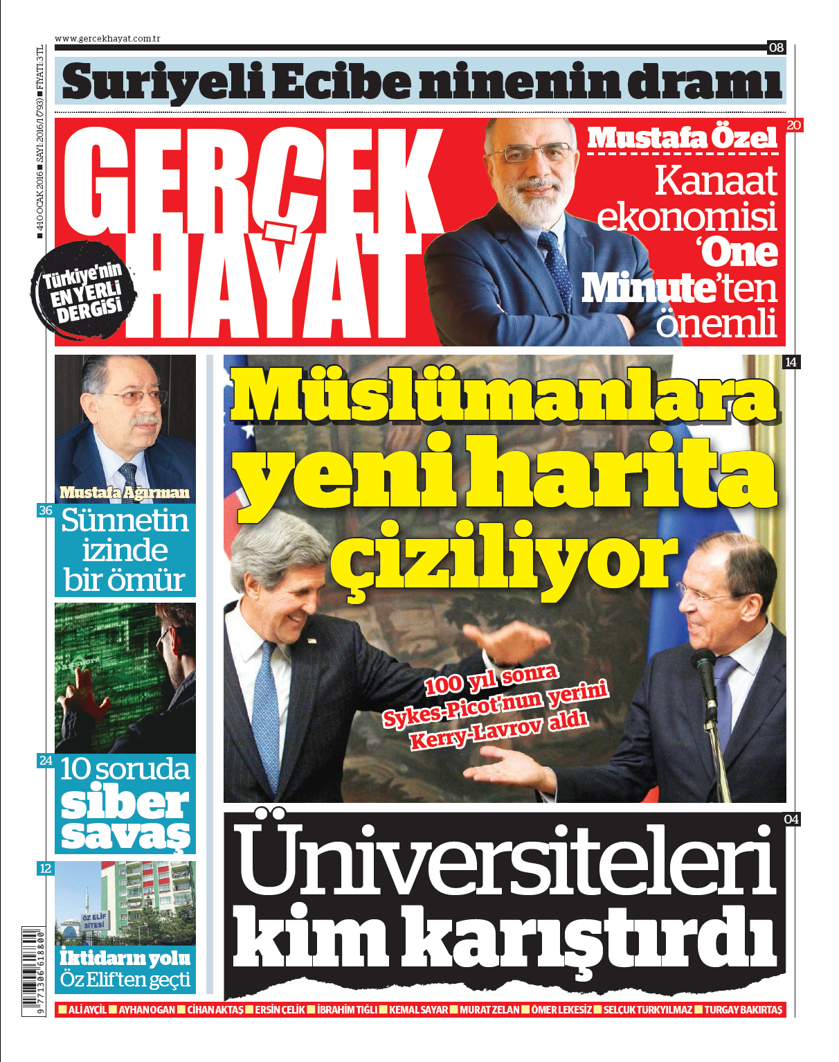 Turan Kışlakçı, bu sayıda coğrafyamız üzerinde hazırlanan yeni harita çalışmalarından söz ediyor. Sykes-Picot anlaşmasının üzerinden tam yüz yıl geçti. Ülkelerimizi, sokaklarımızı, şehirlerimizi, zihinlerimizi ve gönüllerimizi parçalara ayıran bir kirli paylaşım yeniden mi yapılıyor? ABD ile Rusya, Kerry ile Lavrov arasında benzer gizli pazarlıklar mı var? Rusya’nın bu denli Suriye içine girmesi, böyle bir anlaşmanın ürünü mü? Soracağımız çok soru var.