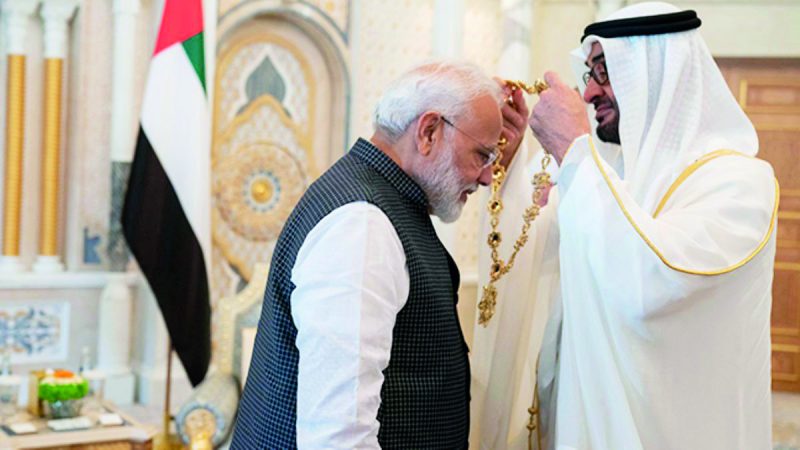Mesela Modi’nin Ağustos 2015’teki ziyareti sırasında iki ülke arasında imzalar atılmış, ilişki düzeyi ‘Kapsamlı Stratejik Ortaklığa’ yükseltilmişti. Modi daha sonra Şubat 2018’de yine bir ziyaret yapmış, BAE’nin ev sahipliği yaptığı ‘Dünya Hükümet Zirvesi’nin açılışını yapma şerefi ev sahibi Bin Zayed tarafından kendisine bahşedilmişti.