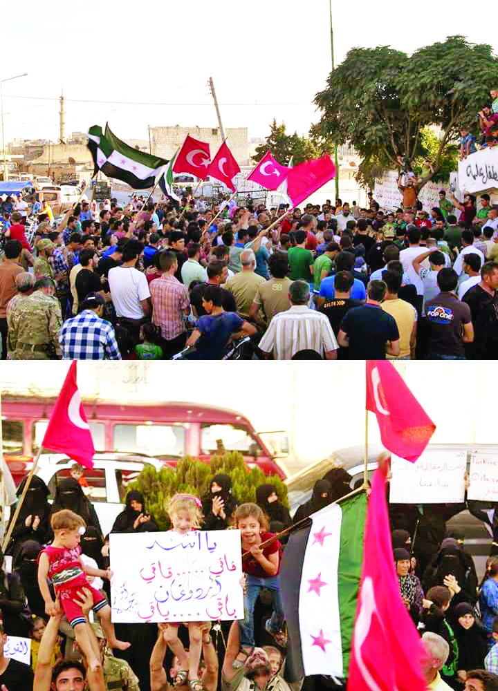 Üstteki fotoğraf, Esed ordusunun gün aşırı bombardımana tuttuğu Suriye’nin İdlip şehrinden. Bu iki fotoğraf karesi 16 Temmuz günü çekildi. Türk milletinin püskürttüğü darbe girişimin sabahında, bombardıman tehlikesine rağmen harabeye dönmüş İdlip sokaklarına dökülen Suriyeliler, çocuk ve yaşlı hep birlikte ellerinde Türkiye bayrakları ile yanımızda olduklarını gösterdiler.