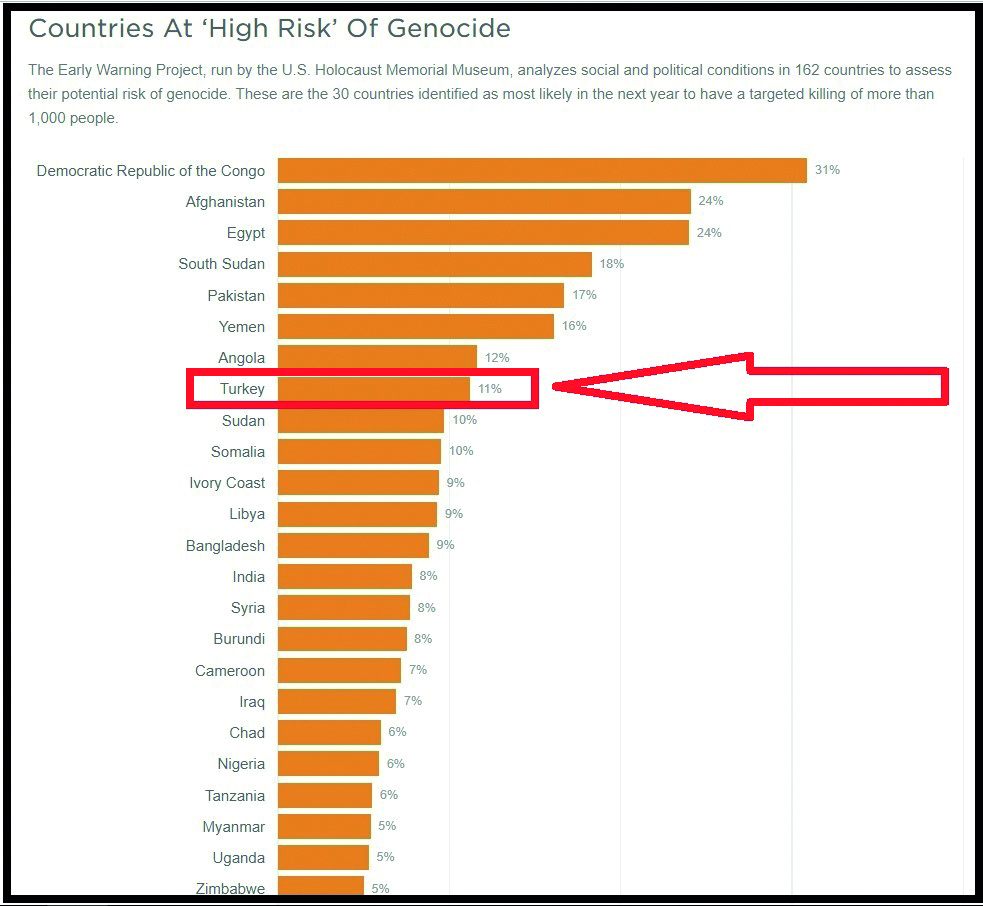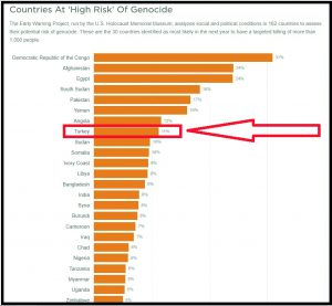 Amerika’da soykırım müzesi tarafından fonlanan bir kuruluşun yaptığı çalışmada önümüzdeki yıl 1000 kişiden fazla insanın öldürülme riski olan 30 ülke sıralanmış ve ülkemiz de neredeyse liste başına oynamış ve 8. sırada yerini almış: